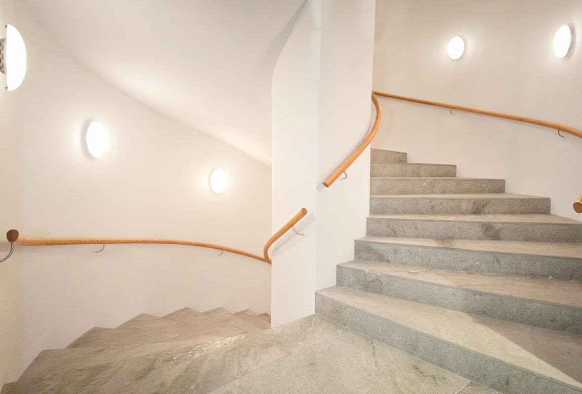 06-01Diese schichtverleimten Mauerhandläufe aus Kastanienholz sorgen für die nötige Sicherheit im Treppenhaus eines fünfstöckigen Bankgebäudes. Der Handlaufquerschnitt besteht aus runden und eliptischen Formen um bestmöglich Ästhetik und Ergonomie zu vereinen. Bei den Handlaufhalterungen haben die Architekten ganz bewusst auf die üblichen Abdeckscheiben gegen die Wand verzichtet, um die Handläufe von unnötigem Ballast "zu befreien".