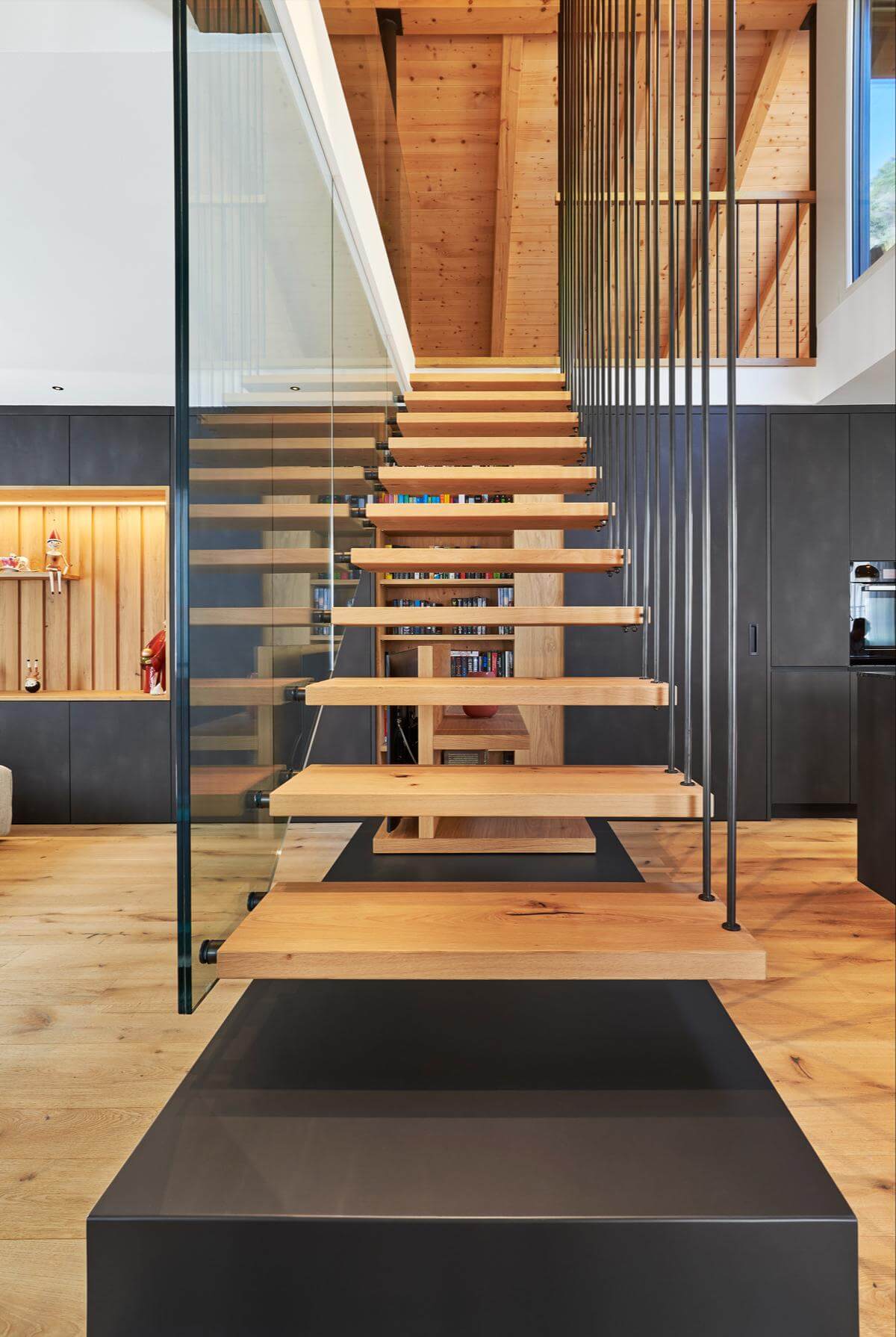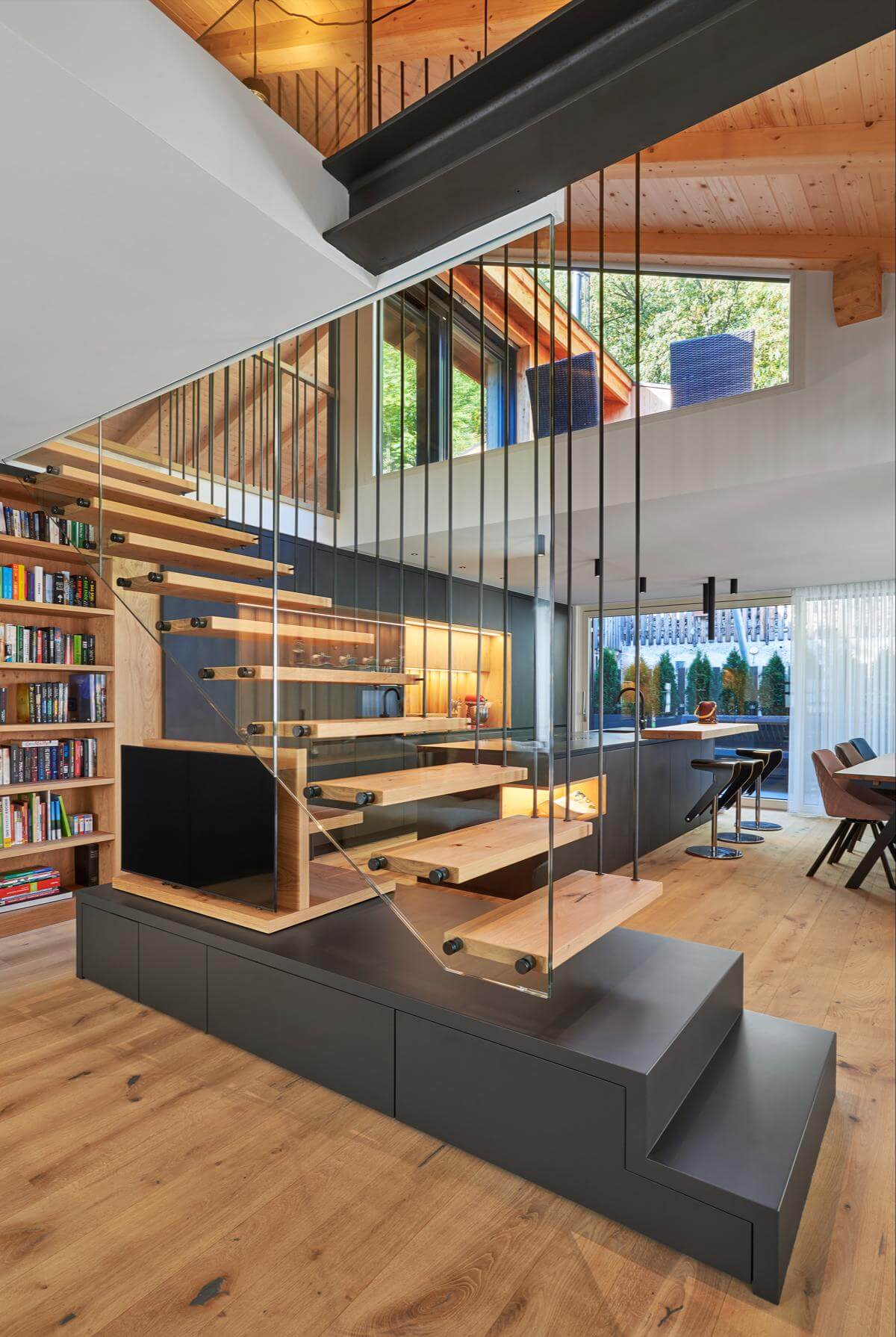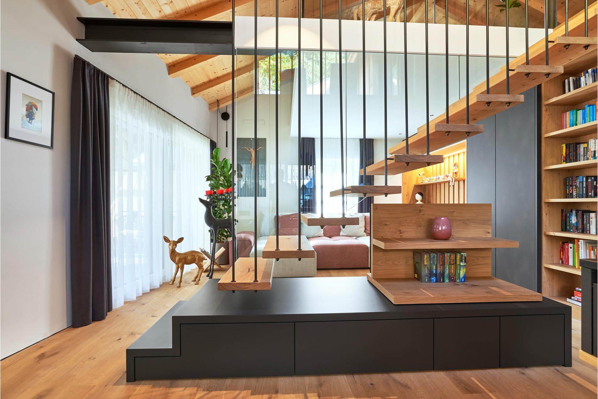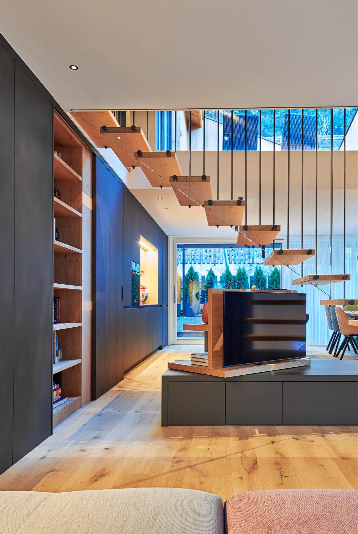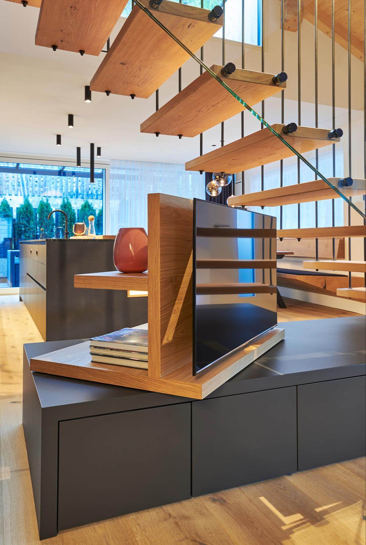 04-02Das feststehende schwarze Unterteil der Treppe mit den zwei Antrittsstufen ist als Möbelstück mit Schubladen gestaltet. Darauf befindet sich ein drehbares Aufsatzmöbel, das vorne einen Fernseher und auf der Rückseite ein Bücherregal trägt.
