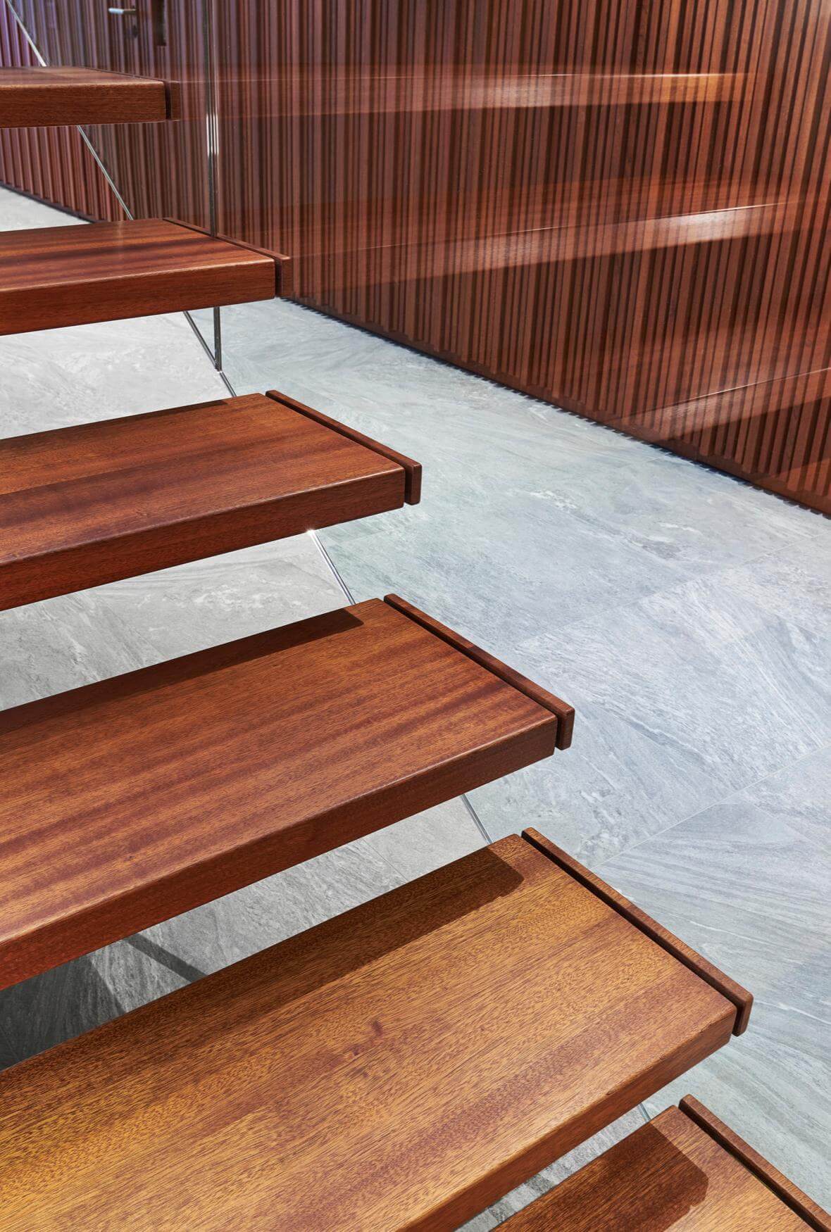 01b-09La scala porta nel seminterrato di una villa, nel quale si trova, fra l’altro, anche una piscina. I materiali scelti per quest’area sono cemento a vita, legno di mogano oliato, vetro e pietra naturale, il tutto in una combinazione particolarmente riuscita. La vetratura verticale della scala sembra appesa al soffitto. Il cliente voleva evitare a tutti i costi supporti visibili. Questi risultano nascosti da un legno di testa. Otticamente si ha l’impressione che i gradini attraversino il vetro.